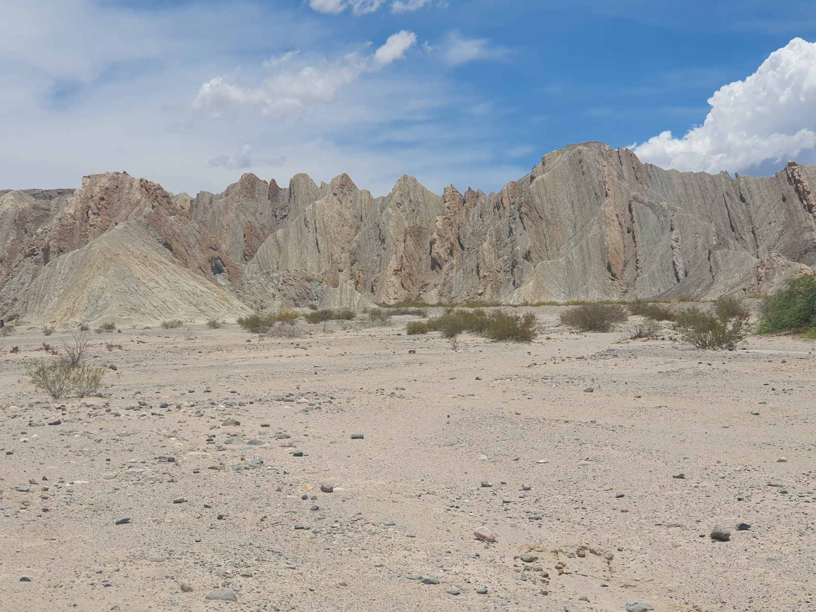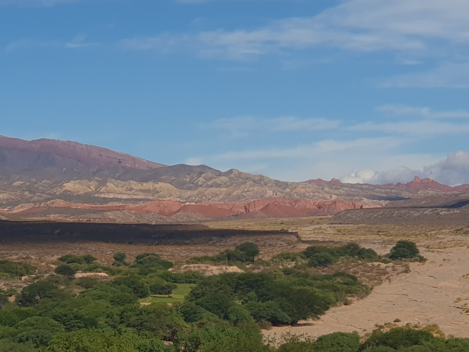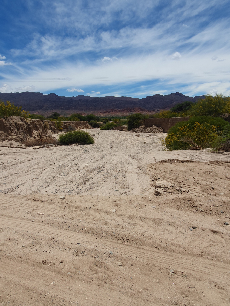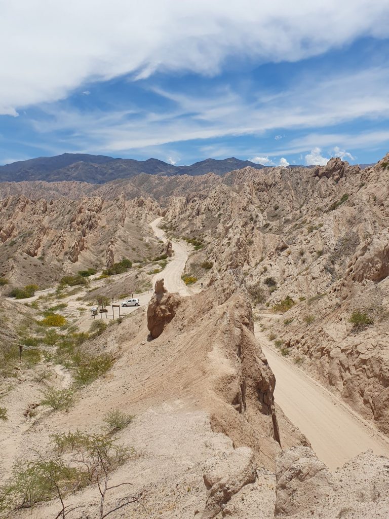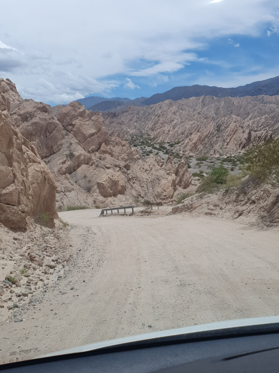 Die Straße ist zwar immer noch die Ruta 40, die wir ja schon in den Tagen zuvor gefahren sind. Aber sie hat nichts mehr mit den kilometerlangen, nur geradeaus und absolut eben verlaufenden Streckenabschnitten der letzten Tage zu tun. Es ist eine Schotterpiste, kurvig, ständig auf und ab, manchmal so eng, dass nur ein Fahrzeug gleichzeitig passieren kann. Die Strecke verläuft vollständig im Tal des Río Calchaqui, mal entlang des Fußbettes, mal im ausgetrockneten Flussbett, mal quer man das Flussbett, mal ist man wieder relativ weit über dem Flussbett. Das alles ist deshalb mit einem normalen PKW natürlich nur möglich in der trockenen oder zumindest wasserarmen Jahreszeit.