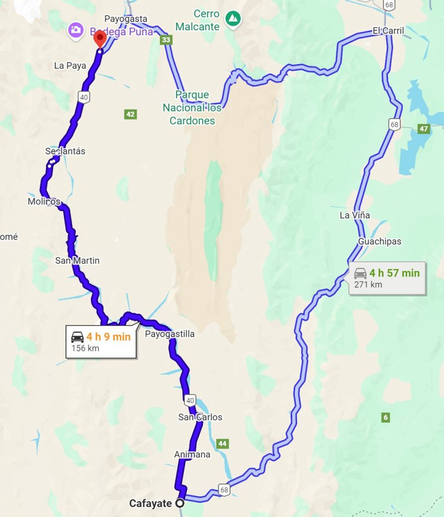 Nun hatten wir alles erledigt und wir konnten uns auf den Weg nach Cachi machen. Dazu stehen grundsätzlich zwei Routen zur Verfügung. Die eine führt über die Ruta 68 und die Ruta 33, ist deutlich länger, dafür aber fast durchgehend asphaltiert. Die andere führt über die bekannte Ruta 40, ist kürzer, aber von der 156 km sind 125 km nicht asphaltiert. Dafür ist diese Strecke aber landschaftlich nicht nur schöner, sondern zum Teil richtig spektakulär. Nachdem wir uns über das Hotel bei der Polizei noch einmal vergewissert hatten, dass die Strecke tatsächlich passierbar ist (manchmal gibt es Probleme beim Durchqueren der (ausgetrockneten) Flußbetten oder Teilabschnitte sind gesperrt), vollgetankt und genügend Wasser eingekauft sowie das Gepäck zum Schutz vor dem Staub in Plastiksäcken eingepackt hatten, machten wir uns auf den Weg.