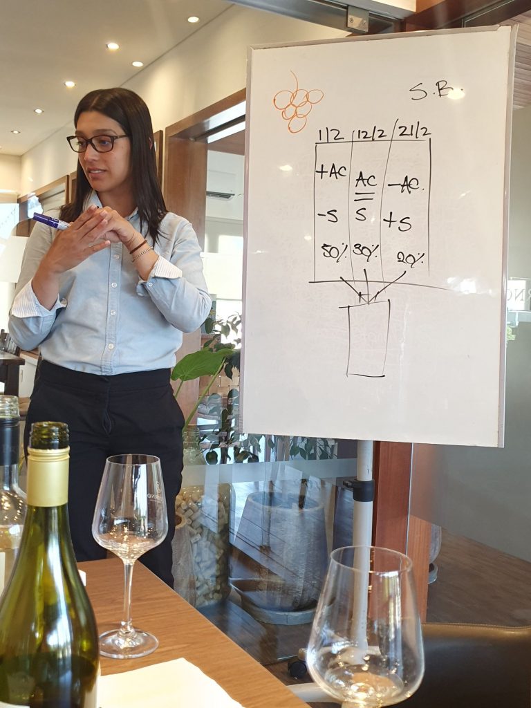 Im Anschluss an die Führung wurden wir zu einer Weinverkostung eingeladen. Zum Testen angeboten wurden zwei Weiß- und zwei Rotweine. Die Weißweine waren zwei Sauvignon blanc, einmal als „junger“ Wein und einmal als Reserva. Ein junger Wein wird schon ein halbes Jahr nach der Kelterung in Flaschen abgefüllt und verkauft. In Uruguay bedeutet das: Die Trauben werden im Februar gelesen und im August/September kann man den Wein schon kaufen. Die Reserva-Weine reifen nach dem Keltern mindestens ein bis zwei Jahre in Edelstahl- oder in Eichenfässern. Beim Rotwein wurde ein junger Wein und ein Reserva-Wein angeboten, jeweils Tannat.